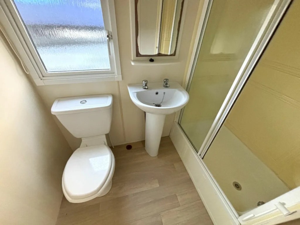 It has a shower room with a basin and toilet, plus an extra toilet with a basin.
