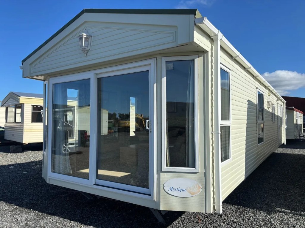 The mobile home is on wheels, and the seller delivers nationwide.