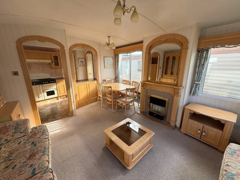 Large open-plan living room with dining space near the fully fitted kitchen.